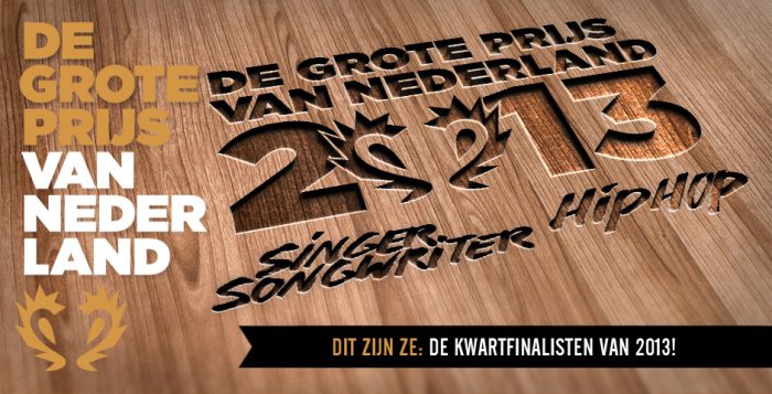 Afgelopen weken schreven zich honderden acts in voor de Grote Prijs van Nederland 2013 in de categorieën Hiphop en Singer-songwriter en nu is de lijst kwartfinalisten compleet. In het totaal gaan per categorie 36 acts de strijd met elkaar aan om de Grote Prijs van Nederland 2013 te winnen. Dit zijn ze dan!