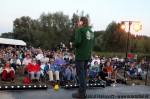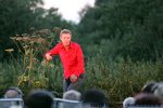 Als de bezoekers zich zetelen in hun klapstoelen loopt Lebbis langs de rand van de open vlakte wat te ijsberen en lijkt in gedachten verzonken. Ondanks zijn fel rode blouse en het contrast met de groene omgeving valt hij niet op. Nog even geen aandacht.