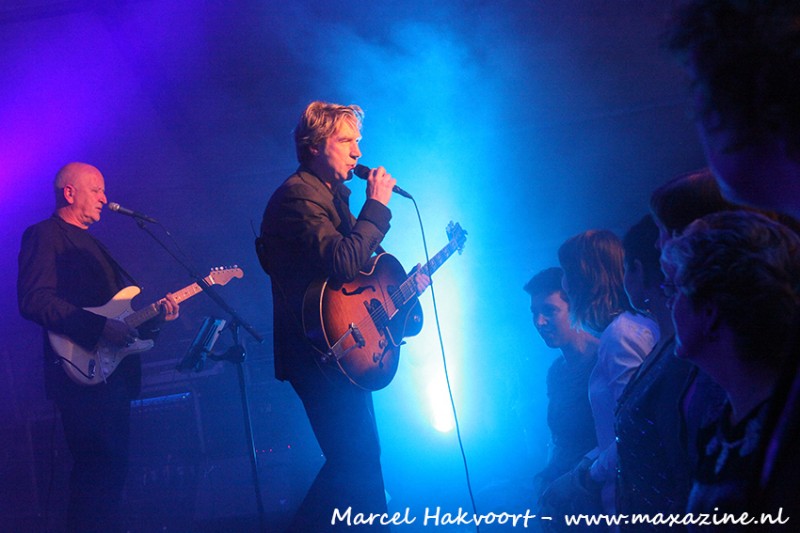 Het gaat er ontspannen aan toe. Wil het voor een fotograaf nog wel eens lastig zijn om vooraan te staan om zijn werk te doen, wordt ik met wat overleg vooraan geaccepteerd. Ik krijg zelf een biertje aangeboden. Ach, even groepsfotootje (met natuurlijk Frank Boeijen op de achtergrond) om wat terug te doen. Even opzij leunen voor een vrouw die met haar compact camera een kiekje wil maken. Na de eerste set doe ik een stapje naar achter. Ik krijg nog een drankje en kan in het tweede deel wat sfeerfoto’s maken met publiek erbij. Het nummer ‘Zwart Wit’ (denk niet zwart-wit, maar in de kleur van je hart) past op de hele avond.