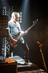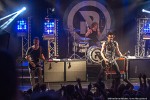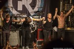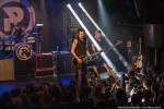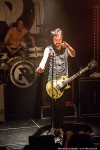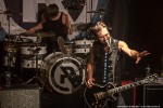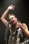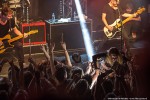 Royal Republic betreedt het podium als een Royal, begeleid door dito muziek. De neiging bestaat om een kniebuiging te maken, maar niemand om me heen komt op die gedachte, of zet die gedachte om in daden. Wat er wel in de hoofden van het publiek naar boven komt bij de eerste noten van Molotov is dansen, springen, beuken en een moshpit vormen. Het begint dus stevig met Molotov en ook Underwear. Jammer dat de dame uit de clip van Underwear niet in de oude Zaal van Melkweg op het podium rondloopt. Wel klimt halverwege de show een meisje uit het publiek op het podium, en springt daarna vanaf het podium het publiek in, op handen gedragen tot achterin de zaal. Songs met een boodschap daar is Royal Republic niet vies van: Make Love not War (If you Have to Make War – make Sure to Make Time to make Love in Between) en Save the Nation geven een goed beeld van de wereldvisie van de band. Een snoertje aan de gitaar van Adam gaat halverwege loszitten, wat een goed teken is, volgens hem: ‘we geven alles, en jullie ook!’. Voordat de band de eerste tonen van Tommy Gun heeft kunnen spelen, neemt de zaal het heft in eigen handen en zingt in het donker hiervan het couplet: zanger Adam ziet het glimlachend aan. Midden in de song moet iedereen op de knieën, ook wij op het balkon worden niet ontzien. Na de break gooit Adam al zijn plectra het publiek in, zijn laatste plectrum gooit hij ook bijna weg. Maar hij beseft net op tijd dat spelen zonder plectrum hem een hand gaat kosten, zeker met de laatste song. Adam: ‘Welke song hebben we dan nog niet gehad?’ Juist: Full Steam Spacemachine! Nog een laatste keer deze avond een moshpit vormen, springen, duwen, trekken en heel hard zingen. De bandleden schudden voor het verlaten van het podium menig hand van fans, en maken een diepe buiging. Adam bedankt het publiek voor hun aanwezigheid: de eerdere show in Melkweg is afgelast, en de bandleden zijn blij dat de fans hen elke keer toch weer weten te vinden, en dat ze blijven komen.