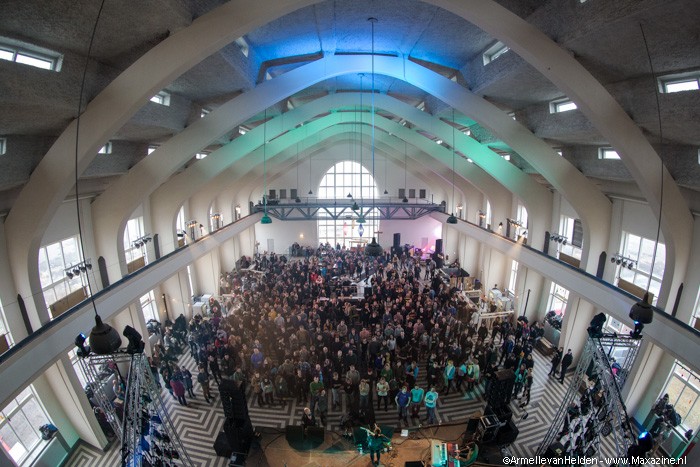 In de loop van de avond gaat de rustige muziek over in zeer dansbare muziek, en is het gedaan met op de grond zitten en luisteren: het Deense October Dance zorgt in de Annex B, een van de twee bijgebouwen, voor een ware disco die je terug brengt naar de jaren ’80. De puntsnor van zanger Tobias draagt hier nog eens extra aan bij. Janne Schra presenteert ons vanavond haar nieuwste album genaamd Ponzo, waarvan de invloed van producer Torre Florim (De Staat) goed hoorbaar is. Aanstekelijke songs met klinkende titels als ‘Everthing I Do Ooh Ooh’, ‘100 Pictures’ en ‘Carry on’ maken stilstaan onmogelijk. Beatboxer Maask laat even later de zaal compleet uit zijn dak gaan met zijn live gesampelde songs. Geen literaire hoogstandjes, maar entertainend is het zeker. Nuno dos Santos en Falco Benz toveren de zenderzaal om tot een danceparty, onafhankelijk van en na elkaar, maar ook samen kunnen ze de zaal in beweging krijgen, het plezier straalt er vanaf.