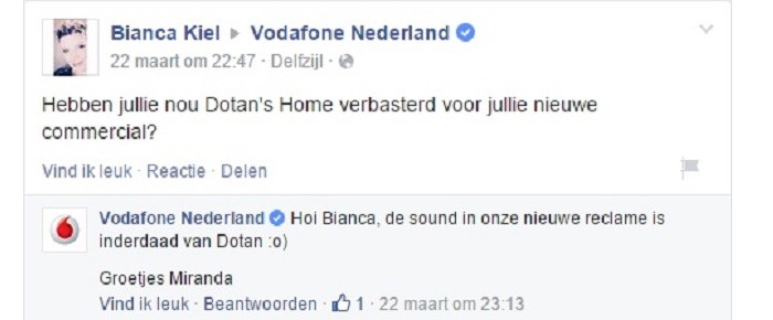 Maxazine liet Bianca Kiel op de Facebookpagina een reactie plaatsen met de mededeling dat het nieuwe Vodafone-deuntje wel verdacht veel op de grote hit uit 2014 lijkte. Social Media-medewerkers van de telecomgigant waren een stuk eerlijker en zonder over de gevolgen na te denken, gaf ene ‘Miranda’ namens Vodafone toe dat het bedrijf het nummer van Dotan heeft gebruikt.