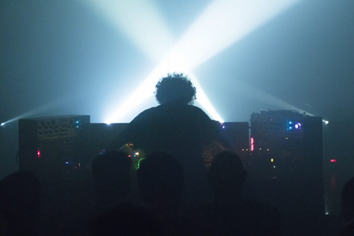 Afgelopen vrijdag was het project in de kleine zaal van de Muziekgieterij te zien en te beleven. In een goed gevulde zaal kon het overwegend internationaal publiek genieten van een uitgebalanceerde show van licht en geluid. Op de beats en ritmes van een in het midden van de zaal geplaatste modulaire synthesizer kon het publiek zich op overwegend ambiente soundscapes en monotone hypnotiserende ritmes laten meeslepen naar een andere dimensie. Op het podium nu geen artiest, maar een ster van de avond van een heel andere orde. Dit bleek een rechthoekig roterend paneel te zijn waar enkele lichtbronnen op waren geprojecteerd. Een vergelijking met de monoliet in Kubricks “2001 Space Odyssey” was zo nu en dan snel gemaakt, maar de afwezigheid van de muziek van Legeti voorkwam dat het een exacte kopie zou zijn.