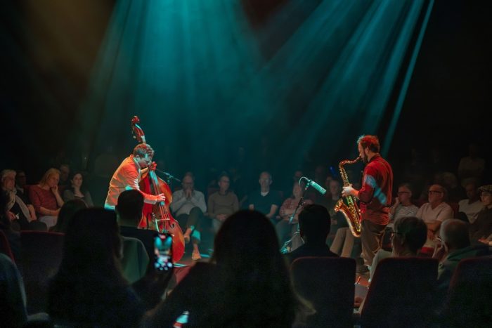 “Mijn muziek is een medicijn voor lichaam en geest”, vertelde bassist Milo Fitzpatrick eerder en wanneer je op zo’n korte afstand van de twee uiterst geconcentreerde muzikanten zat, kreeg je gaandeweg het optreden door wat hij hiermee bedoelde. De sympathieke uit Southampton afkomstige Engelsman en ook bekend van Portico Quartet, gaf eerlijk toe dat hij even moest wennen aan het omringende publiek dat achter zijn rug naar hem zat te kijken. Op voorhand maakte hij vast een soort van excuus voor zijn collega en multi-instrumentalist Jordan Smart (Mammal Hands bandlid), die kennelijk niet geheel fit het podium had betreden. “Vanochtend had hij nog koorts!”, riep Fitzpatrick. Maar in alle eerlijkheid was daar tijdens het concert geen moment iets van te merken. Smart speelde vol verve op zijn meegebrachte instrumenten en leek diep verzonken in de muziek. Hij schakelde net zo makkelijk van tenorsaxofoon naar basklarinet of sopraansaxofoon. Wat een ongelooflijk fijne en betoverende warme sound had deze man.