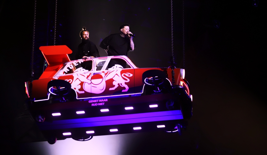 Wat deze avond als rode draad voelde, was al het luchtspektakel. Vanuit alle hoeken en hoogtes doken artiesten op. Het meest opvallend: een auto met daarin Kraantje Pappie en La Fuente die dwars door de zaal werd gehesen.
