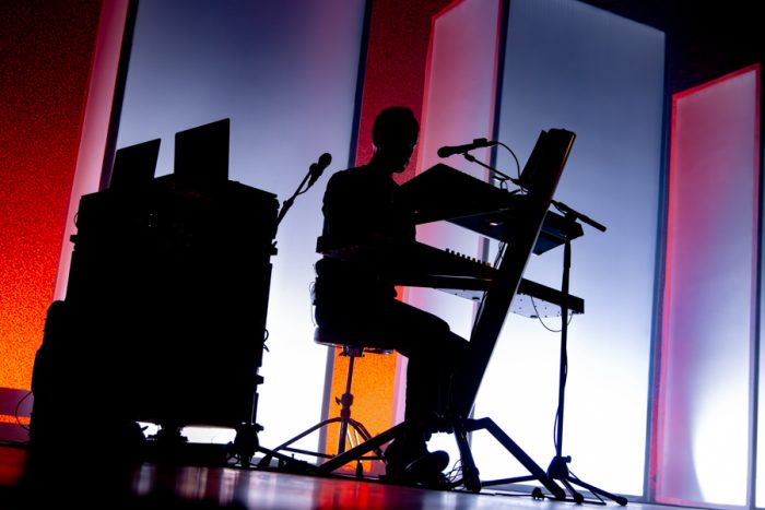 Op het podium stonden een aantal lichtgevende pilaren, wat het geheel net wat extra cachet gaf. Het oogt vrij clean, maar de lichtshow was sterk en vertalend.