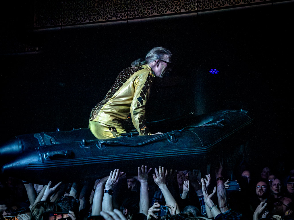 De volgende verrassing kwam tijdens ‘Haifisch’. Chris verruilde zijn keyboard voor een opblaasbootje en dit ging al varend over het publiek heen. Het uitzinnige publiek droeg hem werkelijk op handen. Bij het nummer ‘Rammstein’ had de zanger een brandend pak aan dat de brandende mensen uitbeeldt bij het vliegtuigongeluk op de basis Rammstein in Duitsland.
