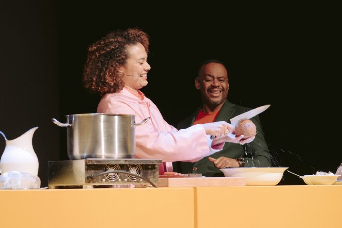 De hoofdrol in de show was weggelegd voor het verhaal van Toemi, de ‘oma’ en oudtante van Noni. Haar reis vanuit Java stond symbool voor de manier waarop Nederland met haar koloniën omging, hoe Suriname zich ontwikkelde en hoe bekende gerechten uiteindelijk ook in Nederland terechtkwamen. Tijdens de show kookte Noni ondertussen oma Toemi’s heerlijke santensoep: een rijke kokossoep met ingrediënten als masala, amsoi en sereh. Het was een mooie metafoor voor de Surinaamse keuken, die invloeden uit verschillende culturen vermengt en waarin alles samenkomt.