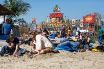 Zaterdag 19 april, tweede dag Paaspop. Het zonnetje scheen al heerlijk en de temperatuur was ook aangenaam. De sfeer was op het terrein erg goed. Het was wel erg druk, maar dat zorgde ook wel wel weer voor een soort gezelligheid. Om 19:00 uur begon La Pegatina in de Apollo. De tent stroomde langzaam vol met mensen die wel zin hadden in een feestje. Wat betreft de temperatuur was de band uit Barcelona wel een goed idee. Vanaf het eerste nummer tot en met het laatste nummer had de band de tent mee. Ze begonnen al vrij in het begin met een confettikanon, dit soort dingen doen het altijd goed bij optredens van feestbands, want dat was het absoluut, een feestje. De band benutte het hele podium, door van de ene kant naar de andere kant te rennen. Dan weer stond de trompettist links en dan weer rechts, zo ook met de meeste andere leden.